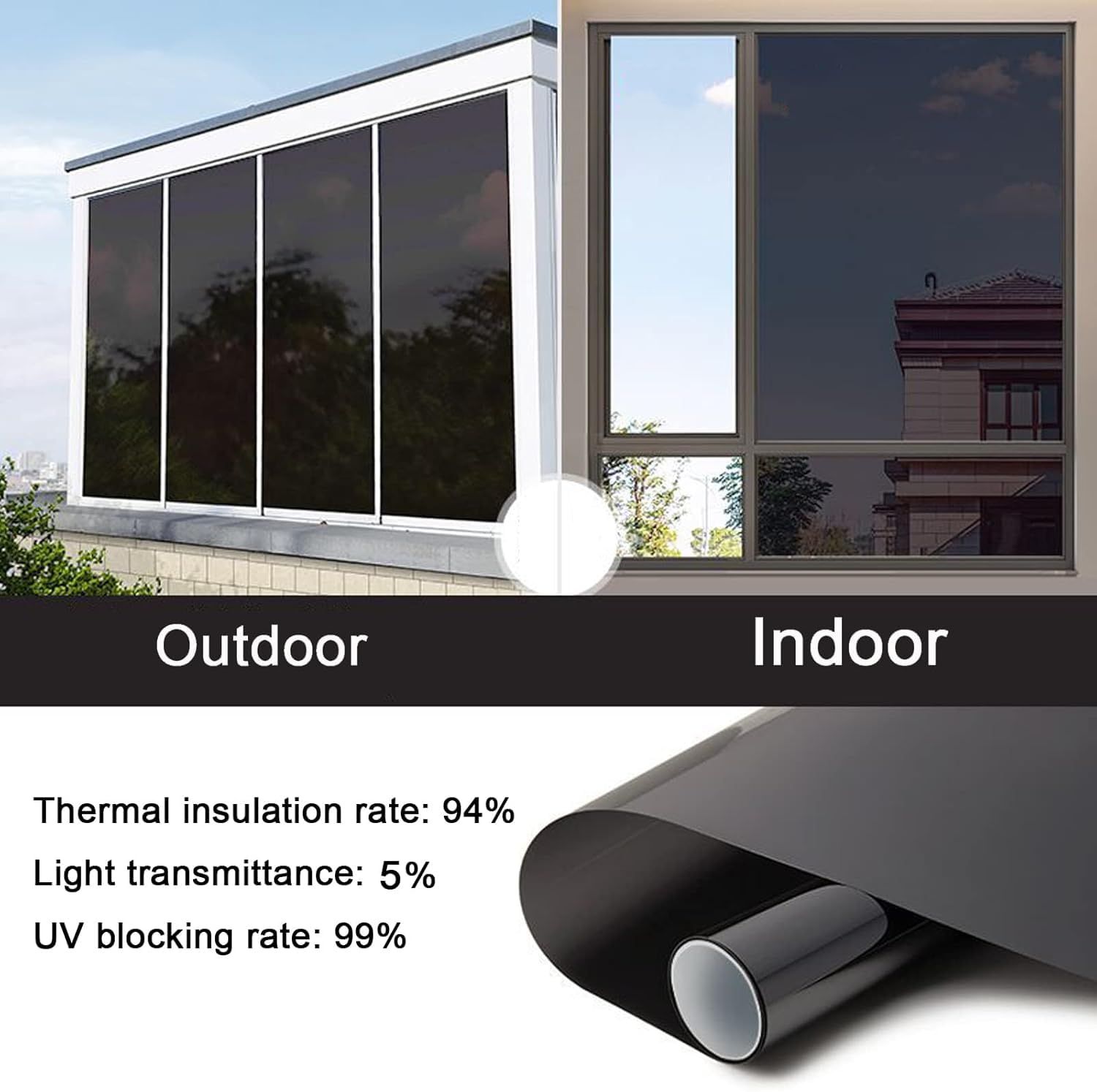 One-Way Mirror Effect: Reflects light on the brighter side, allowing privacy during the day while maintaining clear visibility from the inside.